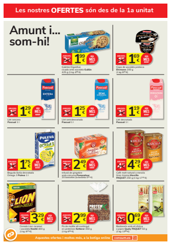 Les nostres OFERTES s%u00f3n des de la 1a unitat169 1 %u20ac 99%u20acABANS:Copa de xocolata proteicaEhrmann 200 g(1 kg: 845 %u20ac)ARAM%u00c9SBARAT175 1 %u20ac 89%u20acABANS:Beguda l%u00e0ctia desnatada Omega 3 Puleva 1 lARAM%u00c9SBARAT119 1 %u20ac 29%u20acABANS:Llet desnatada Pascual 1 lARAM%u00c9S 1 BARAT25 1 %u20ac 35%u20acABANS:Llet semidesnatadaPascual 1 lARAM%u00c9S 1 BARAT29 1 %u20ac 39%u20acABANS:Llet senceraPascual 1 lARAM%u00c9SBARAT429 4 %u20ac 79%u20acABANS:Caf%u00e8 molt natural o mesclaGran Aroma Marcilla PAQUET 250 g (1 kg: 1716 %u20ac)ARAM%u00c9SBARAT069 0 %u20ac 79%u20acABANS:Bastonets amb oli d%u2019olivao pipes Quely PAQUET 50 g (1 kg: 1380 %u20ac)ARAM%u00c9S 3 BARAT29 3 %u20ac 99%u20acABANS:Cereals Lion caramel i xocolata Nestl%u00e9 400 g(1 kg: 823 %u20ac)ARAM%u00c9SBARAT 299 3 %u20ac 59%u20acABANS:Pa de motlle alt continguten prote%u00efnes Ketterer 450 g(1 kg: 664 %u20ac)ARAM%u00c9SBARATAquestes ofertes i moltes m%u00e9s, a la botiga online consum.es249 2 %u20ac 99%u20acABANS:Infusi%u00f3 de gingebre amb c%u00farcuma Pompadour20 bossetes (la bosseta: 012 %u20ac)ARAM%u00c9SBARAT199 2 %u20ac 59%u20acABANS:Galetes Digestive civada amb xocolata Gull%u00f3n425 g (1 kg: 468 %u20ac)ARAM%u00c9SBARATAmunt i... som-hi!