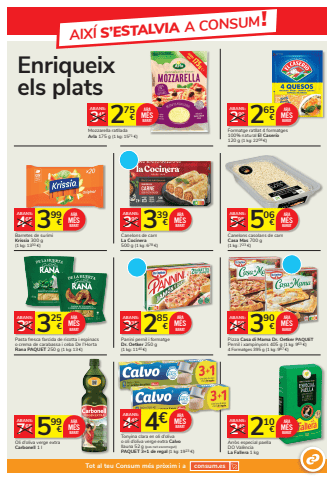 AIX%u00cd S%u2019ESTALVIA A CONSUM!Tot al teu Consum m%u00e9s pr%u00f2xim i a consum.esEnriqueix els plats 506 5 %u20ac 95%u20acABANS:Canelons casolans de carn Casa Mas 700 g (1 kg: 723 %u20ac)ARAM%u00c9SBARAT265 2 %u20ac 99%u20acABANS:Formatge ratllat 4 formatges 100% natural El Caser%u00edo120 g (1 kg: 2208 %u20ac)ARAM%u00c9SBARAT599 7 %u20ac 65%u20acABANS:Oli d%u2019oliva verge extraCarbonell 1 lARAM%u00c9SBARAT 210 2 %u20ac 49%u20acABANS:Arr%u00f2s especial paella DO Val%u00e8ncia La Fallera 1 kgARAM%u00c9SBARAT339 3 %u20ac 99%u20acABANS:Canelons de carn La Cocinera500 g (1 kg: 678 %u20ac)ARAM%u00c9SBARAT325 3 %u20ac 95%u20acABANS:Pasta fresca farcida de ricotta i espinacso crema de carabassa i ceba De l%u2019HortaRana PAQUET 250 g (1 kg: 13 %u20ac)ARAM%u00c9SBARAT 390 4 %u20ac 59%u20acABANS:Pizza Casa di Mama Dr. Oetker PAQUETPernil i xampinyons 405 g (1 kg: 963 %u20ac)4 Formatges 395 g (1 kg: 987 %u20ac)ARAM%u00c9S 2 BARAT85 3 %u20ac 35%u20acABANS:Panini pernil i formatgeDr. Oetker 250 g (1 kg: 1140 %u20ac)ARAM%u00c9SBARAT399 4 %u20ac 65%u20acABANS:Barretes de surimi Krissia 300 g(1 kg: 1330 %u20ac)ARAM%u00c9SBARAT275 3 %u20ac 45%u20acABANS:Mozzarella ratllada Arla 175 g (1 kg: 1571 %u20ac)ARAM%u00c9SBARAT4%u20ac 449%u20acABANS:Tonyina clara en oli d%u2019olivao oli d%u2019oliva verge extra Calvollauna 52 g (pes net escorregut)PAQUET 3+1 de regal (1 kg: 1923 %u20ac)ARAM%u00c9SBARAT