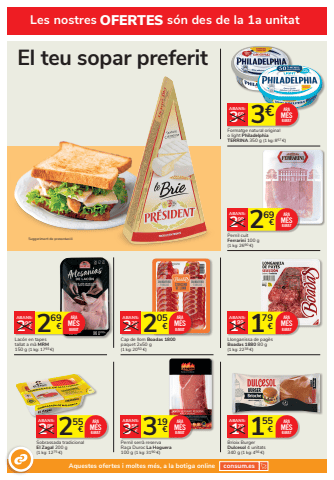 255 2 %u20ac 85%u20acABANS:Sobrassada tradicional El Zagal 200 g(1 kg: 1275 %u20ac)ARAM%u00c9SBARAT269 2 %u20ac 99%u20acABANS:Lac%u00f3n en tapes tallat a m%u00e0 MRM150 g (1 kg: 1793 %u20ac)ARAM%u00c9SBARAT319 3 %u20ac 55%u20acABANS:Pernil serr%u00e0 reserva Ra%u00e7a Duroc La Hoguera100 g (1 kg: 3190 %u20ac)ARAM%u00c9SBARAT205 2 %u20ac 29%u20acABANS:Cap de llom Boadas 1800paquet 2x50 g(1 kg: 2050 %u20ac)ARAM%u00c9SBARAT269 2 %u20ac 99%u20acABANS:Pernil cuitFerrarini 100 g(1 kg: 2690 %u20ac)ARAM%u00c9SBARAT179 1 %u20ac 99%u20acABANS:Llonganissa de pag%u00e8sBoadas 1880 80 g (1 kg: 2238 %u20ac)ARAM%u00c9SBARAT3%u20ac 369%u20acABANS:Formatge natural original o light Philadelphia TERRINA 350 g (1 kg: 857 %u20ac)ARAM%u00c9SBARAT155 1 %u20ac 79%u20acABANS:Brioix Burger Dulcesol 4 unitats 340 g (1 kg: 456 %u20ac)ARAM%u00c9SBARATEl teu sopar preferitLes nostres OFERTES s%u00f3n des de la 1a unitatAquestes ofertes i moltes m%u00e9s, a la botiga online consum.esSuggeriment de presentaci%u00f3