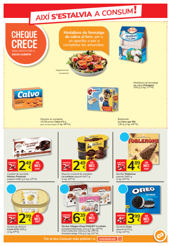 Medallons de formatge de cabra al forn, per a un aperitiu o per a completar les amanides.Musclos en escabetx13/18 peces Calvo 69 g (pes net escorregut) (1 kg: 3609 %u20ac)Medallons de formatge de cabra Pr%u00e9sident200 g (1 kg: 1745 %u20ac)299 3 %u20ac 99%u20acABANS:Sorbet de llimonaCarte D%u2019Or 500 g(1 kg: 598 %u20ac)ARAM%u00c9SBARAT249 2 %u20ac 99%u20acABANS:Coulant de xocolata Maison Prolainatpaquet 2x90 g (1 kg: 1383 %u20ac)ARAM%u00c9SBARAT 489 5 %u20ac 75%u20acABANS:Bomb%u00f3 Tobleronepaquet 3x65 g(1 kg: 2508 %u20ac)ARAM%u00c9SBARATSuggeriment de presentaci%u00f3639 7 %u20ac 49%u20acABANS:Terrina H%u00e4agen-Dazs PAQUET 4 unitatsCaramel Attraction 321 g (1 kg: 1991 %u20ac)Fruit Collection 326 g (1 kg: 1960 %u20ac)Xocolata belga 324 g (1 kg: 1972 %u20ac)ARAM%u00c9SBARAT 399 4 %u20ac 99%u20acABANS:Sandvitx Oreopaquet 4x70 g (1 kg: 1425 %u20ac)ARAM%u00c9SBARAT249 2 %u20ac 99%u20acABANS:Mousse cruixent de xocolataLa Lechera paquet 4x57 g(1 kg: 1092 %u20ac)ARAM%u00c9SBARATBastonets La Vaca que R%u00ede 140 g (1 kg: 1850 %u20ac)AIX%u00cd S%u2019ESTALVIA A CONSUM!Tot al teu Consum m%u00e9s pr%u00f2xim i a consum.esCHEQUE CRECEDESCOMPTE PER A SOCIS CLIENTS