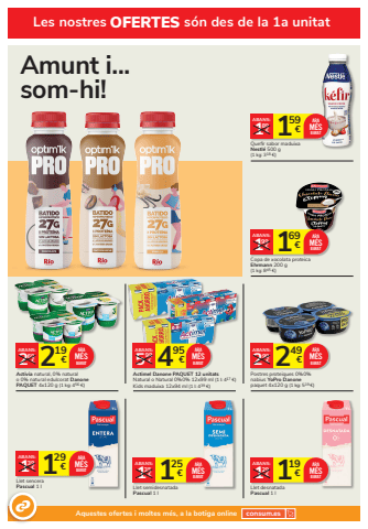 Amunt i... som-hi!249 2 %u20ac 99%u20acABANS:Postres proteiques 0%0% nabius YoPro Danonepaquet 4x120 g (1 kg: 519 %u20ac)ARAM%u00c9S 2 BARAT19 2 %u20ac 69%u20acABANS:Activia natural, 0% naturalo 0% natural edulcorat DanonePAQUET 4x120 g (1 kg: 456 %u20ac)ARAM%u00c9SBARAT 495 5 %u20ac 99%u20acABANS:Actimel Danone PAQUET 12 unitatsNatural o Natural 0%0% 12x99 ml (1 l: 417 %u20ac)Kids maduixa 12x94 ml (1 l: 439 %u20ac)ARAM%u00c9SBARAT159 1 %u20ac 89%u20acABANS:Quefir sabor maduixaNestl%u00e9 500 g (1 kg: 318 %u20ac)ARAM%u00c9SBARAT169 1 %u20ac 99%u20acABANS:Copa de xocolata proteicaEhrmann 200 g(1 kg: 845 %u20ac)ARAM%u00c9SBARAT119 1 %u20ac 29%u20acABANS:Llet desnatada Pascual 1 lARAM%u00c9S 1 BARAT25 1 %u20ac 35%u20acABANS:Llet semidesnatadaPascual 1 lARAM%u00c9S 1BARAT29 1 %u20ac 39%u20acABANS:Llet senceraPascual 1 lARAM%u00c9SBARATLes nostres OFERTES s%u00f3n des de la 1a unitatAquestes ofertes i moltes m%u00e9s, a la botiga online consum.es