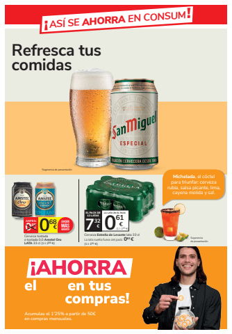 Refresca tus comidas%u00a1AS%u00cd SE AHORRA EN CONSUM!Acumulas el 1%u201925% a partir de 50%u20ac en compras mensuales.Sugerencia de presentaci%u00f3n068 0 %u20ac 85%u20acANTES:Cerveza tostadao tostada 0,0 Amstel OroLATA 33 cl (1 l: 206 %u20ac)AHORAM%u00c1SBARATOCerveza Estrella de Levante lata 33 clLa lata suelta fuera del pack: 063 %u20ac(1 l: 191 %u20ac)EL PACK DE12 LATASLA LATA EN EL PACK0(1 l: 185 %u20ac)61 7 %u20ac 32%u20acMichelada, el c%u00f3ctel para triunfar: cerveza rubia, salsa picante, lima, cayena molida y sal.Sugerenciade presentaci%u00f3n