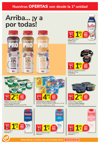 Nuestras OFERTAS son desde la 1%u00aa unidadEstas ofertas y muchas m%u00e1s en la tienda online consum.esArriba%u2026 %u00a1y a por todas!249 2 %u20ac 99%u20acANTES:Postre proteico 0%0% ar%u00e1ndanos YoPro Danonepack 4x120 g (1 kg: 519 %u20ac)AHORAM%u00c1S 2 BARATO19 2 %u20ac 69%u20acANTES:Activia natural, 0% naturalo 0% natural edulcoradoDanone PACK 4x120 g (1 kg: 456 %u20ac)AHORAM%u00c1SBARATO 495 5 %u20ac 99%u20acANTES:Actimel Danone PACK 12 uds.Natural o Natural 0%0% 12x99 ml (1 l: 417 %u20ac)Kids fresa 12x94 ml (1 l: 439 %u20ac)AHORAM%u00c1SBARATO159 1 %u20ac 89%u20acANTES:K%u00e9fir sabor fresaNestl%u00e9 500 g (1 kg: 318 %u20ac)AHORAM%u00c1SBARATO169 1 %u20ac 99%u20acANTES:Copa de chocolate proteica Ehrmann 200 g(1 kg: 845 %u20ac)AHORAM%u00c1SBARATO119 1 %u20ac 29%u20acANTES:Leche desnatada Pascual 1 lAHORAM%u00c1S 1 BARATO25 1 %u20ac 35%u20acANTES:Leche semidesnatadaPascual 1 lAHORAM%u00c1S 1BARATO29 1 %u20ac 39%u20acANTES:Leche entera Pascual 1 lAHORAM%u00c1SBARATO