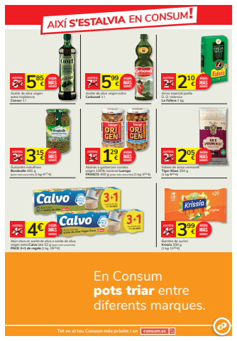 399 4 %u20ac 65%u20acANTES:Barritas de surimi Krissia 300 g(1 kg: 1330 %u20ac)AHORAM%u00c1SBARATO210 2 %u20ac 49%u20acANTES:Arroz especial paella D. O. Valencia La Fallera 1 kgAHORAM%u00c1SBARATO315 3 %u20ac 89%u20acANTES:Guisantes extrafinos Bonduelle 465 g (peso neto escurrido) (1 kg: 677 %u20ac)AHORAM%u00c1SBARATO585 6 %u20ac 99%u20acANTES:Aceite de oliva virgenextra HojiblancaCoosur 1 lAHORAM%u00c1SBARATO205 2 %u20ac 39%u20acANTES:Fideos de arroz vermicelli Tiger Khan 250 g(1 kg: 820 %u20ac)AHORAM%u00c1SBARATO599 7 %u20ac 65%u20acANTES:Aceite de oliva virgen extra Carbonell 1 lAHORAM%u00c1SBARATO4%u20ac 449%u20acANTES:At%u00fan claro en aceite de oliva o aceite de olivavirgen extra Calvo lata 52 g (peso neto escurrido)PACK 3+1 de regalo (1 kg: 1923 %u20ac)AHORAM%u00c1SBARATO129 1 %u20ac 49%u20acANTES:Alubias o garbanzos cocidos origen 100% nacional Luengo FRASCO 400 g (peso neto escurrido) (1 kg: 323 %u20ac)AHORAM%u00c1SBARATOAIX%u00cd S%u2019ESTALVIA EN CONSUM!Tot en el teu Consum m%u00e9s pr%u00f2xim i en consum.esEn Consumpots triar entre diferents marques.