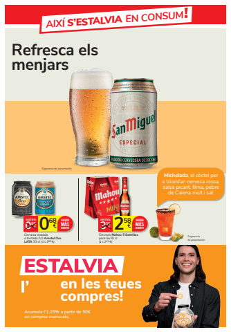 Acumula l%u20191,25% a partir de 50%u20ac en compres mensuals.Sugerencia de presentaci%u00f3n258 3 %u20ac 55%u20acANTES:Cerveza Mahou 5 Estrellaspack 6x20 cl(1 l: 215 %u20ac)AHORAM%u00c1S 0 BARATO68 0 %u20ac 85%u20acANTES:Cerveza tostadao tostada 0,0 Amstel OroLATA 33 cl (1 l: 206 %u20ac)AHORAM%u00c1SBARATOMichelada, el c%u00f2ctel per a triomfar: cervesa rossa, salsa picant, llima, pebre de Caiena molt i sal.Sugerenciade presentaci%u00f3nAIX%u00cd S%u2019ESTALVIA EN CONSUM!Refresca els menjarsen les teues compres!