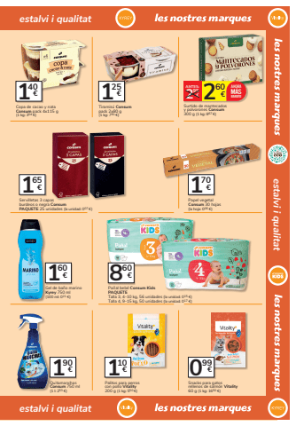 140%u20acCopa de cacao y nata Consum pack 4x115 g(1 kg: 304 %u20ac)125%u20acTiramis%u00fa Consumpack 2x80 g (1 kg: 781 %u20ac)260 2 %u20ac 95%u20acANTES:Surtido de mantecados y polvorones Consum300 g (1 kg: 867 %u20ac)AHORAM%u00c1SBARATO160%u20acGel de ba%u00f1o marino Kyrey 750 ml (100 ml: 021 %u20ac)190%u20acQuitamanchasConsum 750 ml (1 l: 253 %u20ac)110%u20acPalitos para perros con pollo Vitality200 g (1 kg: 550 %u20ac)099%u20acSnacks para gatos rellenos de salm%u00f3n Vitality60 g (1 kg: 1650 %u20ac)860%u20acPa%u00f1al beb%u00e9 Consum KidsPAQUETETalla 3, 4-10 kg, 56 unidades (la unidad: 015 %u20ac)Talla 4, 9-15 kg, 50 unidades (la unidad: 017 %u20ac)165%u20acServilletas 3 capas burdeos o negra ConsumPAQUETE 25 unidades (la unidad: 007 %u20ac)170%u20acPapel vegetal Consum 30 hojas(la hoja: 006 %u20ac) estalvi i qualitatestalvi i qualitatestalvi i qualitat