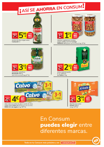 210 2 %u20ac 49%u20acANTES:Arroz especial paella D. O. Valencia La Fallera 1 kgAHORAM%u00c1SBARATO%u00a1AS%u00cd SE AHORRA EN CONSUM!En Consum puedes elegir entre diferentes marcas.Todo en tu Consum m%u00e1s pr%u00f3ximo y en consum.es399 4 %u20ac 65%u20acANTES:Barritas de surimi Krissia 300 g(1 kg: 1330 %u20ac)AHORAM%u00c1SBARATO315 3 %u20ac 89%u20acANTES:Guisantes extrafinos Bonduelle 465 g (peso neto escurrido) (1 kg: 677 %u20ac)AHORAM%u00c1SBARATO599 7 %u20ac 65%u20acANTES:Aceite de oliva virgen extra Carbonell 1 lAHORAM%u00c1SBARATO4%u20ac 449%u20acANTES:At%u00fan claro en aceite de oliva o aceite de olivavirgen extra Calvo lata 52 g (peso neto escurrido)PACK 3+1 de regalo (1 kg: 1923 %u20ac)AHORAM%u00c1SBARATO129 1 %u20ac 49%u20acANTES:Alubias o garbanzos cocidos origen 100% nacional Luengo FRASCO 400 g (peso neto escurrido) (1 kg: 323 %u20ac)AHORAM%u00c1SBARATO