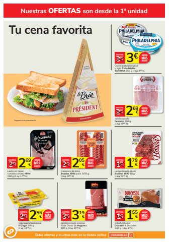 Nuestras OFERTAS son desde la 1%u00aa unidadEstas ofertas y muchas m%u00e1s en la tienda online consum.es255 2 %u20ac 85%u20acANTES:Sobrasada tradicional El Zagal 200 g(1 kg: 1275 %u20ac)AHORAM%u00c1SBARATO269 2 %u20ac 99%u20acANTES:Lac%u00f3n en tapas cortado a mano MRM150 g (1 kg: 1793 %u20ac)AHORAM%u00c1SBARATO319 3 %u20ac 55%u20acANTES:Jam%u00f3n serrano reserva Raza Duroc La Hoguera100 g (1 kg: 3190 %u20ac)AHORAM%u00c1SBARATO205 2 %u20ac 29%u20acANTES:Cabecero de lomo Boadas 1800 pack 2x50 g(1 kg: 2050 %u20ac)AHORAM%u00c1SBARATO269 2 %u20ac 99%u20acANTES:Jam%u00f3n cocido Ferrarini 100 g(1 kg: 2690 %u20ac)AHORAM%u00c1SBARATO179 1 %u20ac 99%u20acANTES:Longaniza de pay%u00e9s Boadas 1880 80 g (1 kg: 2238 %u20ac)AHORAM%u00c1SBARATO3%u20ac 369%u20acANTES:Queso natural original o light Philadelphia TARRINA 350 g (1 kg: 857 %u20ac)AHORAM%u00c1SBARATO155 1 %u20ac 79%u20acANTES:Brioche Burger Dulcesol 4 unidades 340 g (1 kg: 456 %u20ac)AHORAM%u00c1SBARATOTu cena favoritaSugerencia de presentaci%u00f3n