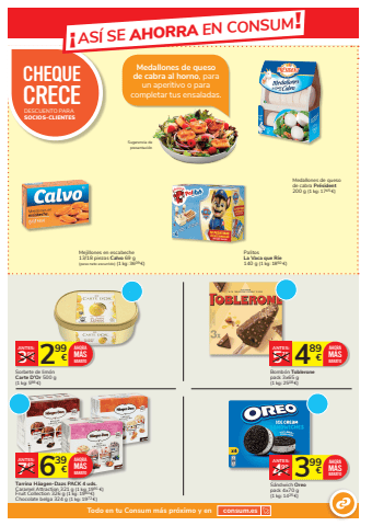 Todo en tu Consum m%u00e1s pr%u00f3ximo y en consum.esMedallones de queso de cabra al horno, para un aperitivo o para completar tus ensaladas.Mejillones en escabeche 13/18 piezas Calvo 69 g (peso neto escurrido) (1 kg: 3609 %u20ac)Medallones de queso de cabra Pr%u00e9sident200 g (1 kg: 1745 %u20ac)DESCUENTO PARASOCIOS-CLIENTESCHEQUE CRECE%u00a1AS%u00cd SE AHORRA EN CONSUM!299 3 %u20ac 99%u20acANTES:Sorbete de lim%u00f3nCarte D%u2019Or 500 g(1 kg: 598 %u20ac)AHORAM%u00c1SBARATO 489 5 %u20ac 75%u20acANTES:Bomb%u00f3n Tobleronepack 3x65 g(1 kg: 2508 %u20ac)AHORAM%u00c1SBARATOSugerencia de presentaci%u00f3n639 7 %u20ac 49%u20acANTES:Tarrina H%u00e4agen-Dazs PACK 4 uds.Caramel Attraction 321 g (1 kg: 1991 %u20ac)Fruit Collection 326 g (1 kg: 1960 %u20ac)Chocolate belga 324 g (1 kg: 1972 %u20ac)AHORAM%u00c1SBARATO 399 4 %u20ac 99%u20acANTES:S%u00e1ndwich Oreopack 4x70 g (1 kg: 1425 %u20ac)AHORAM%u00c1SBARATOPalitos La Vaca que R%u00ede 140 g (1 kg: 1850 %u20ac)