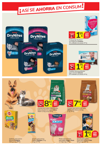 %u00a1AS%u00cd SE AHORRA EN CONSUM!795 8 %u20ac 99%u20acANTES:Comida para perros con pollo Ultima Mini Senior 1,5 kg (1 kg: 530 %u20ac)AHORAM%u00c1SBARATOGalletas para perros Biscrok Pedigree500 g (1 kg: 598 %u20ac)Snacks para perros Rodeo Pedigree 70 g(1 kg: 2129 %u20ac)Perlas absorbentes para gatos Magic Clean1,7 kg (1 kg: 279 %u20ac)175 2 %u20ac 05%u20acANTES:Toallitas desmaquillantes agua micelar Salustar20 unidades (la unidad: 009 %u20ac)AHORAM%u00c1SBARATO155 1 %u20ac 95%u20acANTES:Protegeslip Flexiform sin fragancia Carefree 30 unidades (la unidad: 005 %u20ac)AHORAM%u00c1SBARATO160 1 %u20ac 95%u20acANTES:Snacks para gatos Party Mix Original Felix60 g (1 kg: 2667 %u20ac) AHORAM%u00c1SBARATO840 10 %u20ac 50%u20acANTES:Comida para gatos esterilizados bolas de pelo con pavo UltimaAdult 1,5 kg (1 kg: 560 %u20ac)AHORAM%u00c1SBARATO