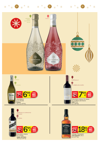 699 7 %u20ac 90%u20acANTES:Vino blanco D. O. Rueda Protos75 cl (1 l: 932 %u20ac)AHORAM%u00c1SBARATOVERDEJOD. O. RUEDAVERDEJO /VIURA /SAUVIGNONBLANCBOBAL1899 23 %u20ac 25%u20acANTES:Whisky Tennessee Jack Daniel%u2019s 70 cl(1 l: 2713 %u20ac)AHORAM%u00c1SBARATO799 8 %u20ac 99%u20acANTES:Vino tinto crianza 14 mesesD. O. Ribera del Duero409 75 cl(1 l: 1065 %u20ac)AHORAM%u00c1SBARATO695 8 %u20ac 15%u20acANTES:Vino tinto crianzaD. O. RiojaL%u00f3pez de Haro75 cl (1 l: 927 %u20ac)AHORAM%u00c1SBARATOTEMPRANILLO / GARNACHA/GRACIANOD. O. RIOJATEMPRANILLOD. O. RIBERA DEL DUERO