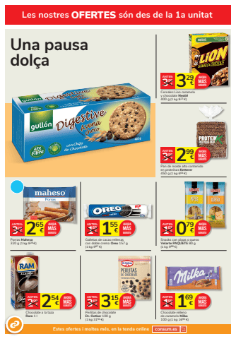 329 3 %u20ac 99%u20acANTES:Cereales Lion caramelo y chocolate Nestl%u00e9400 g (1 kg: 823 %u20ac)AHORAM%u00c1SBARATO299 3 %u20ac 59%u20acANTES:Pan de molde alto contenido en prote%u00ednas Ketterer450 g (1 kg: 664 %u20ac)AHORAM%u00c1SBARATO315 3 %u20ac 69%u20acANTES:Perlitas de chocolate Dr. Oetker 100 g (1 kg: 3150 %u20ac)AHORAM%u00c1SBARATO 169 1 %u20ac 99%u20acANTES:Chocolate relleno de caramelo Milka 100 g (1 kg: 1690 %u20ac)AHORAM%u00c1S 2 BARATO54 2 %u20ac 99%u20acANTES:Chocolate a la taza Ram 1 lAHORAM%u00c1SBARATO155 1 %u20ac 85%u20acANTES:Galletas de cacao rellenas con doble crema Oreo 157 g(1 kg: 987 %u20ac)AHORAM%u00c1S 2 BARATO65 3 %u20ac 29%u20acANTES:Porras Maheso320 g (1 kg: 828 %u20ac)AHORAM%u00c1SBARATO 079 1 %u20ac 03%u20acANTES:Snacks con pipas o queso Velarte PAQUETE 80 g(1 kg: 988 %u20ac)AHORAM%u00c1SBARATOUna pausa dol%u00e7aLes nostres OFERTES s%u00f3n des de la 1a unitatEstes ofertes i moltes m%u00e9s, en la tenda online consum.es