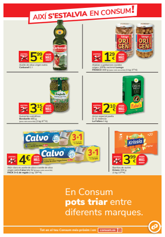 210 2 %u20ac 49%u20acANTES:Arroz especial paella D. O. Valencia La Fallera 1 kgAHORAM%u00c1SBARATO399 4 %u20ac 65%u20acANTES:Barritas de surimi Krissia 300 g(1 kg: 1330 %u20ac)AHORAM%u00c1SBARATO315 3 %u20ac 89%u20acANTES:Guisantes extrafinos Bonduelle 465 g (peso neto escurrido) (1 kg: 677 %u20ac)AHORAM%u00c1SBARATO4%u20ac 449%u20acANTES:At%u00fan claro en aceite de oliva o aceite de olivavirgen extra Calvo lata 52 g (peso neto escurrido)PACK 3+1 de regalo (1 kg: 1923 %u20ac)AHORAM%u00c1SBARATO129 1 %u20ac 49%u20acANTES:Alubias o garbanzos cocidos origen 100% nacional Luengo FRASCO 400 g (peso neto escurrido) (1 kg: 323 %u20ac)AHORAM%u00c1SBARATOAIX%u00cd S%u2019ESTALVIA EN CONSUM!Tot en el teu Consum m%u00e9s pr%u00f2xim i en consum.esEn Consumpots triar entre diferents marques.599 7 %u20ac 65%u20acANTES:Aceite de oliva virgen extra Carbonell 1 lAHORAM%u00c1SBARATO