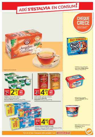 Galletas con gotas de chocolate Chips Ahoy!256 g (1 kg: 1559 %u20ac)Margarina vegetaloriginal Tulip%u00e1n 400 g(1 kg: 648 %u20ac)Nata fresca extracremosa Pr%u00e9sident 200 g(1 kg: 1475 %u20ac)429 4 %u20ac 79%u20acANTES:Caf%u00e9 molido natural o mezclaGran Aroma Marcilla PAQUETE 250 g (1 kg: 1716 %u20ac)AHORAM%u00c1S 2 BARATO19 2 %u20ac 69%u20acANTES:Activia natural, 0% naturalo 0% natural edulcoradoDanone PACK 4x120 g (1 kg: 456 %u20ac)AHORAM%u00c1SBARATO495 5 %u20ac 99%u20acANTES:Actimel Danone PACK 12 uds.Natural o Natural 0%0% 12x99 ml (1 l: 417 %u20ac)Kids fresa 12x94 ml (1 l: 439 %u20ac)AHORAM%u00c1SBARATOSugerencia de presentaci%u00f3nAIX%u00cd S%u2019ESTALVIA EN CONSUM!Tot en el teu Consum m%u00e9s pr%u00f2xim i en consum.esCHEQUE CRECEDESCOMPTE PER A SOCIS CLIENTS