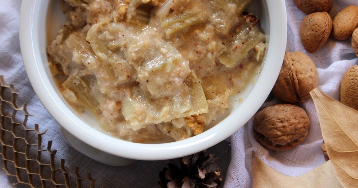Wash the cardoons, chop them and cook them in salted water until tender. For the sauce, toast some almonds and crush them, then sauté them with garlic and a little flour, add the cooking broth from the cardoons and let it reduce. Mix the cardoons with the sauce and serve warm. This is a traditional recipe in many regions and provides high amounts of potassium and antioxidants.
